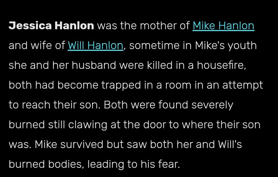 And it turns out that the fire in the bar is just the adults Will and his wife, who died there, and their son Mike (the hero of the film) escaped. That's why, at the beginning of the film, it shows Mike the horrors, like burnt hands reaching out from behind the door with terrible screams. Because he was there himself and saw it.